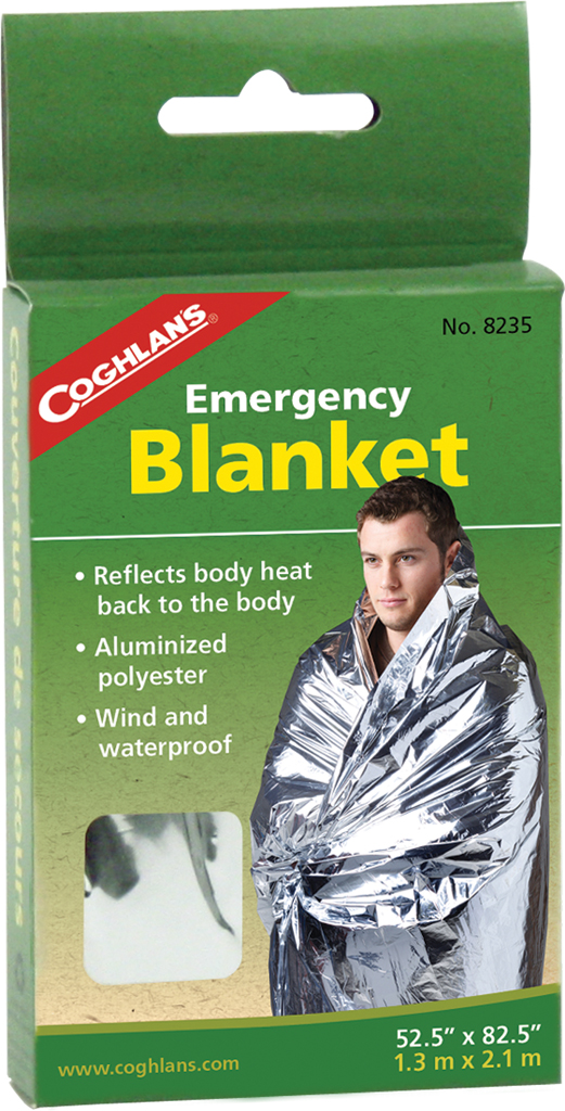 A compact, lightweight blanket made from aluminised, non-stretch polyester. Stays flexible in freezing temperatures. Reflects body heat back to body. Wind and waterproof.
