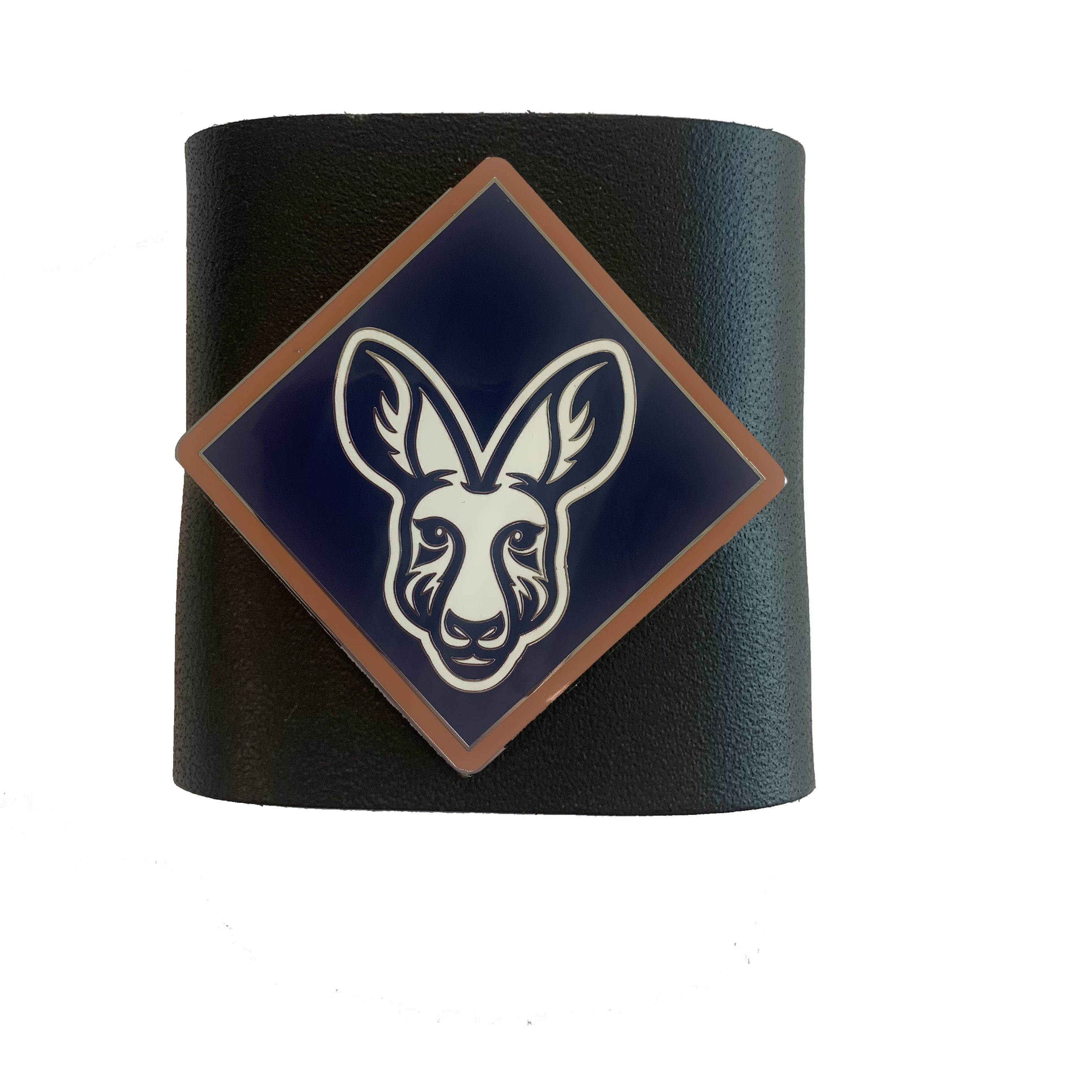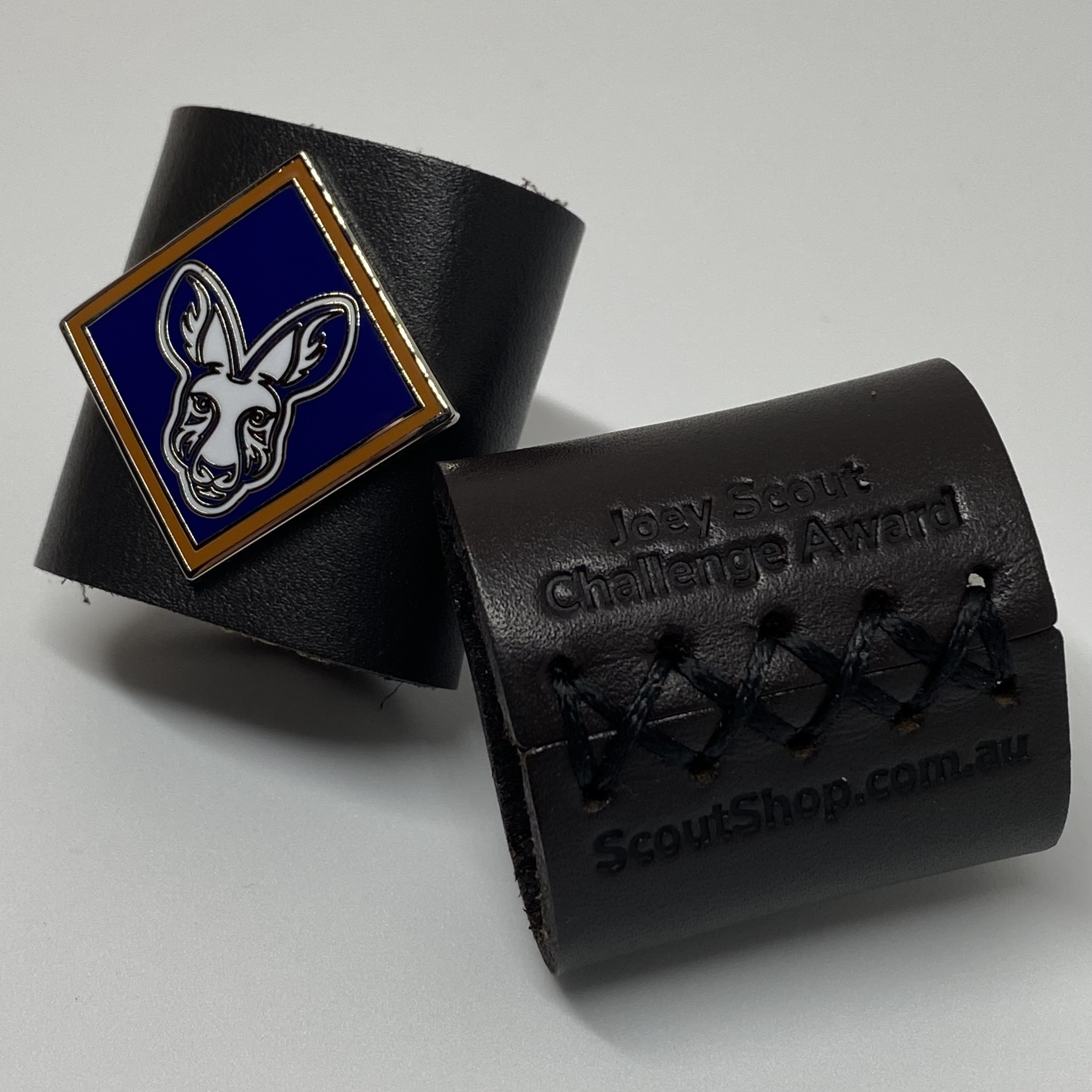The pins on the metal badge have been designed to slightly distort the shape of the leather woggle to better frame the metal badge.