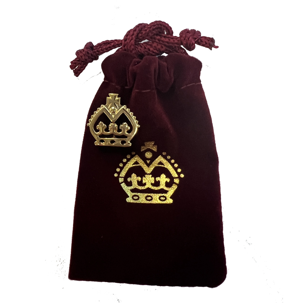 The pin comes in a Venturer maroon coloured velvet storage bag with a King's Scout Award logo printed on the front, the pin includes an end cap.