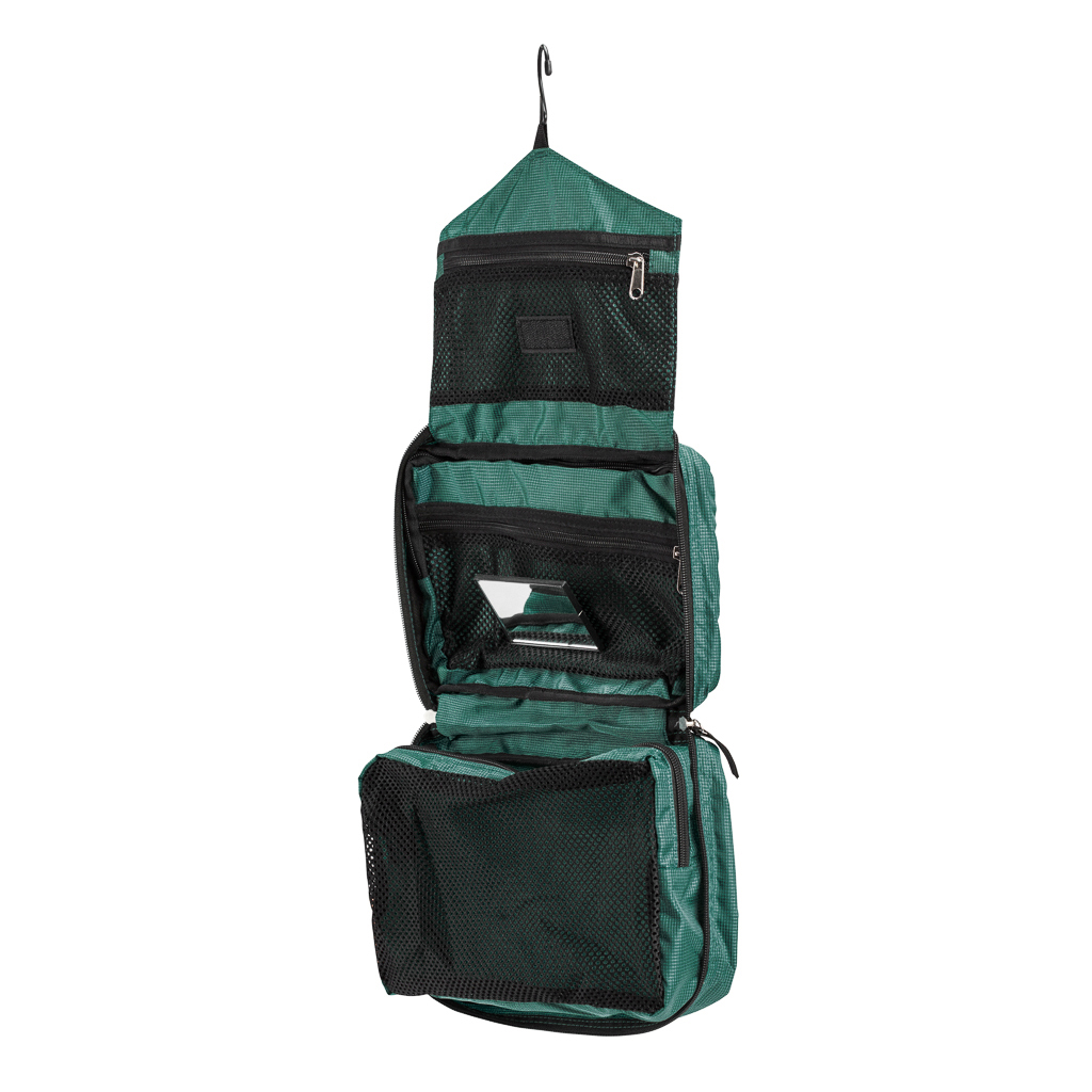 - 4 Zippered pockets hold toiletries securely