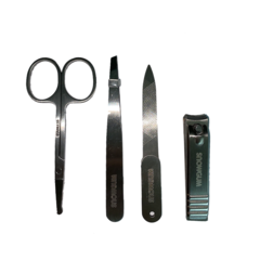 This set includes quality stainless steel nail clippers, tweezers, nail file and scissors - all contained in a press stud pouch.